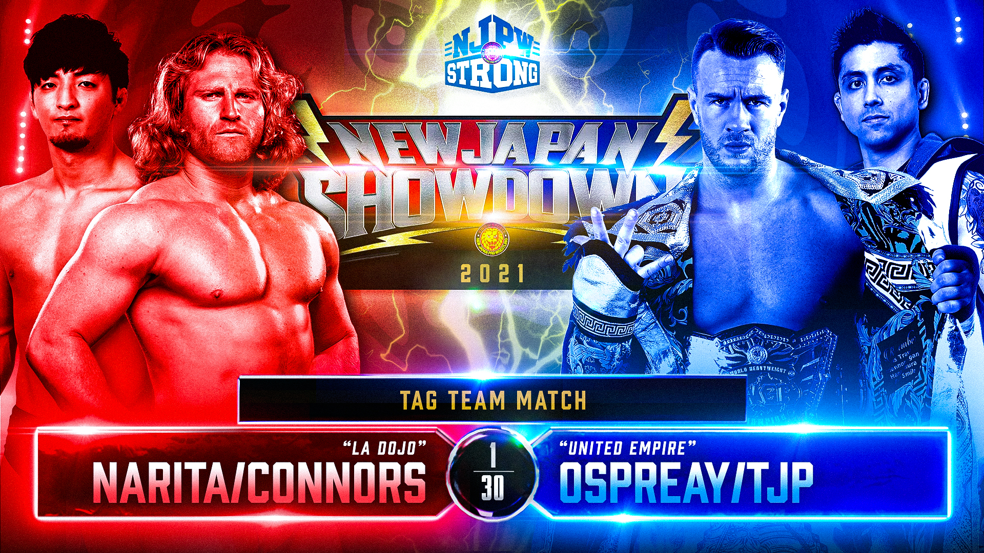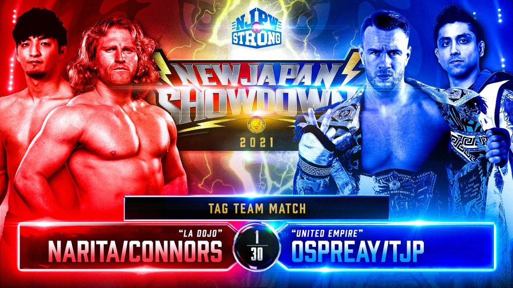 TJP grabs Narita’s leg. Ospreay takes a cheap shot on Narita, laying him out with Pip Pip Cheerio. Narita ducks the Hidden Blade and kicks Ospreay back to the floor. He holds onto Ospreay’s IWGP World Heavyweight Championship title and tosses it to him. Narita then gets the microphone and says he is not interested in Ospreay’s fake belt – he just wants to defeat him. He warns Ospreay not to underestimate the LA DOJO.